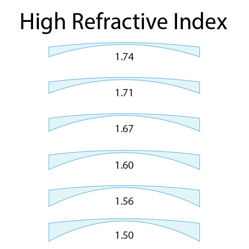 In other words, for a given eyeglass lens power, a lens made of a material with a high refractive index will be thinner than a lens made of a material with a lower refractive index.